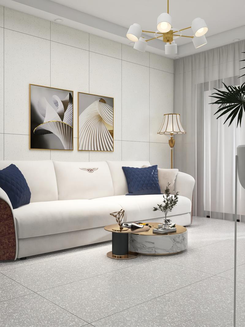 - ?設(shè)計(jì)?:水磨石茶幾(白色基底+藍(lán)色琉璃碎片),桌腿用亞克力材質(zhì),打造“懸浮”視覺(jué)效果。