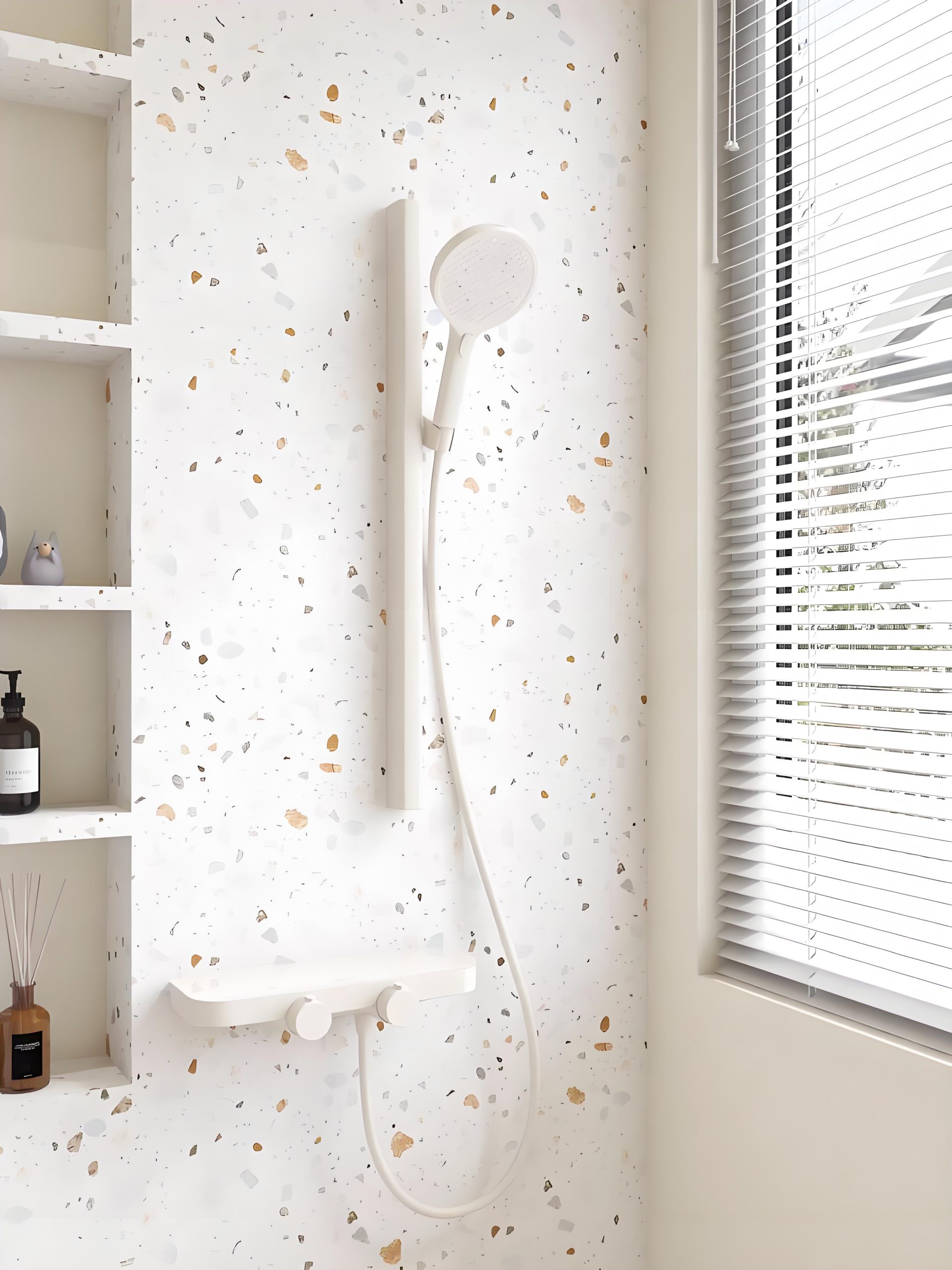 - ?設(shè)計(jì)?:墻面通鋪米白色水磨石(5mm金色+灰色顆粒),搭配黑色極簡(jiǎn)衛(wèi)浴五金,鏡面柜延伸至天花板,放大空間感。